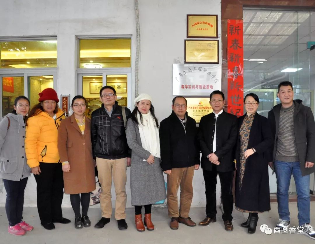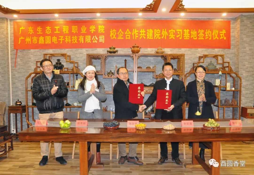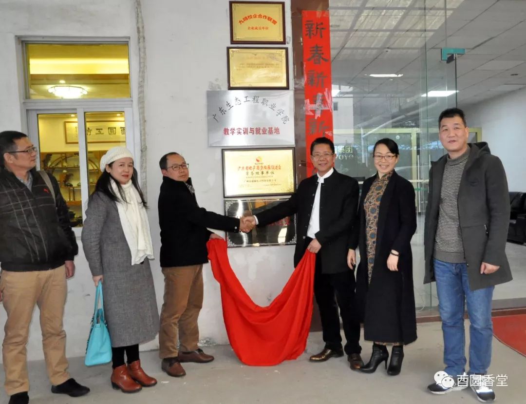 2017年12月19日下午,廣東生態工程職業學院領導老師一行七人蒞臨我司參觀考察,同時舉行《校企合作共建院外實習基地簽約儀式》及《教學實訓與就業基地》現場揭牌儀式。這次校企合作開啟了未來香行業產學研發展的新模式,我司董事長(酉圓工坊創始人)李榮清先生、酉圓香堂堂主郭香遞女士以及副總經理丘現雪先生等一起參與見證了簽約揭牌儀式。