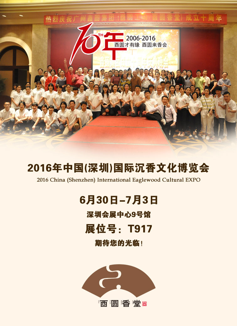 2016年中國(深圳)國際沉香文化博覽會的展覽范圍涉及沉香工藝品、沉香制品、沉香貴重收藏品、香器香具等,將與第12屆中國(深圳)國際茶產業博覽會和第5屆深港澳國際名酒展同期舉辦。展會期間為配合香器具精品展示、推廣沉香文化,組委會還將舉辦“2016深圳十大鑒香師大賽”、“中國(深圳)香文化小姐大賽”、“第二屆國際「茶·香中國」文化論壇”、“2016中國香行業十大評選頒獎盛典”等多個業界重大活動。我司旗下酉圓香堂的展位號是T917,酉圓才有緣,酉圓來香會。期待與您香約,我們不見不散。