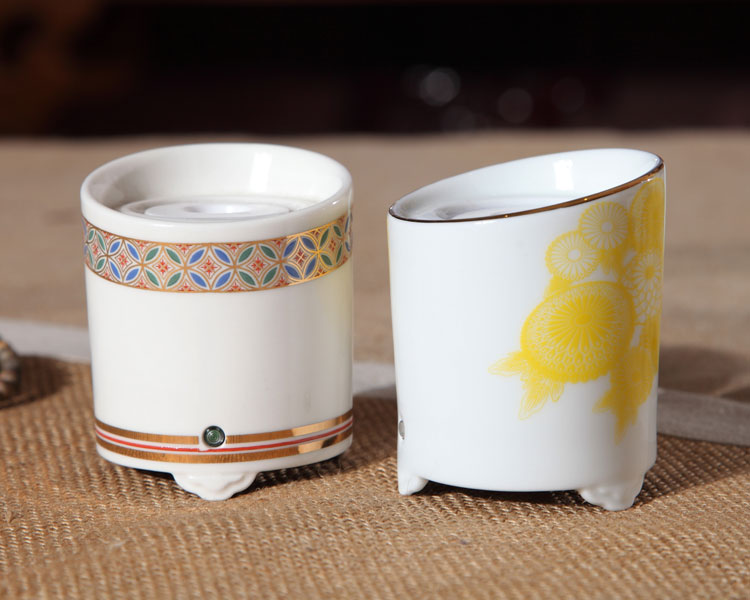 根據傳統空熏法的品香流程體驗,斜口品香器的造型設計更容易使香味聚集。采用臺灣陶瓷工藝,爐身繪銅錢或菊花圖案,銅錢寓意財富,菊花寓意雅潔。品香器首次采用了瓷器描金工藝,燦爛華貴。器形小巧,內帶可充電鋰電池,溫度調節范圍為50~250℃,爐底為拔盤式調溫,使用簡單方便。