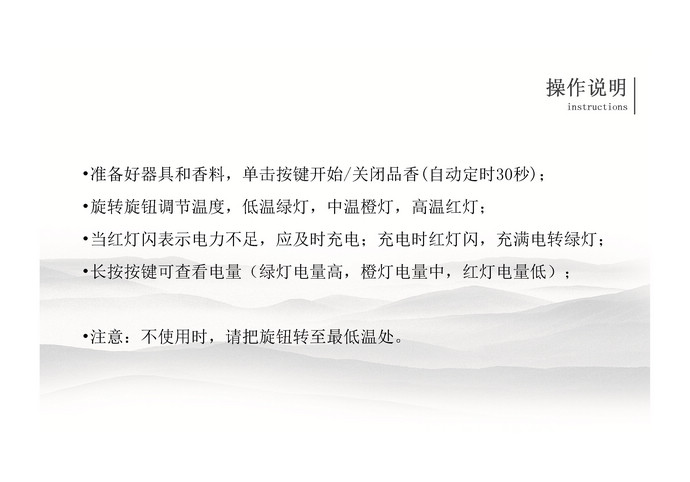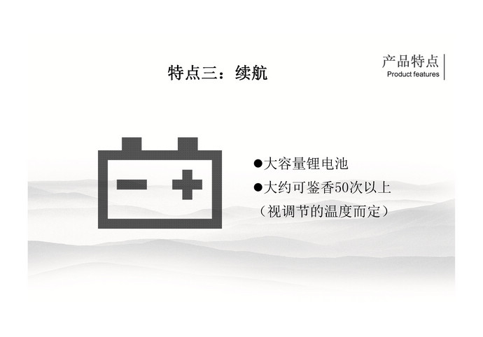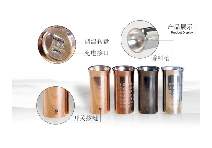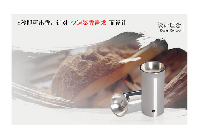 該產品為滿足快速鑒香需求而設計,5秒內即可出香。外殼采用不銹鋼,全金屬外殼,堅固耐用,手感極佳。器形精致小巧,便于攜帶,重量只有75g,比普通的智能手機輕一倍。底部拔盤式調溫,溫度調節范圍為70~350℃。內置可充電鋰電池,每次鑒香使用30秒,滿電量時可以使用50次左右。