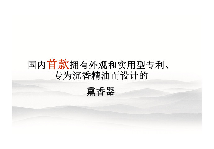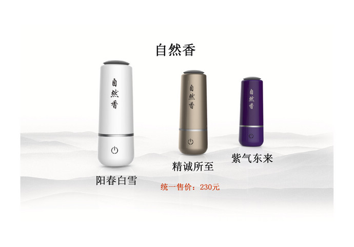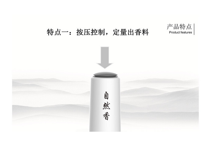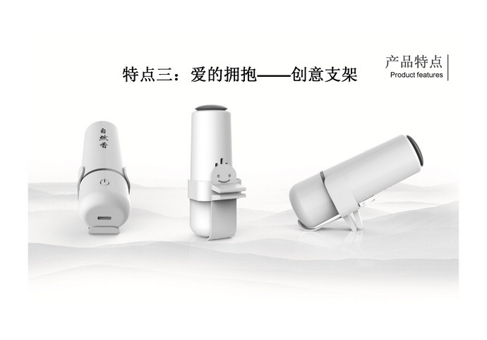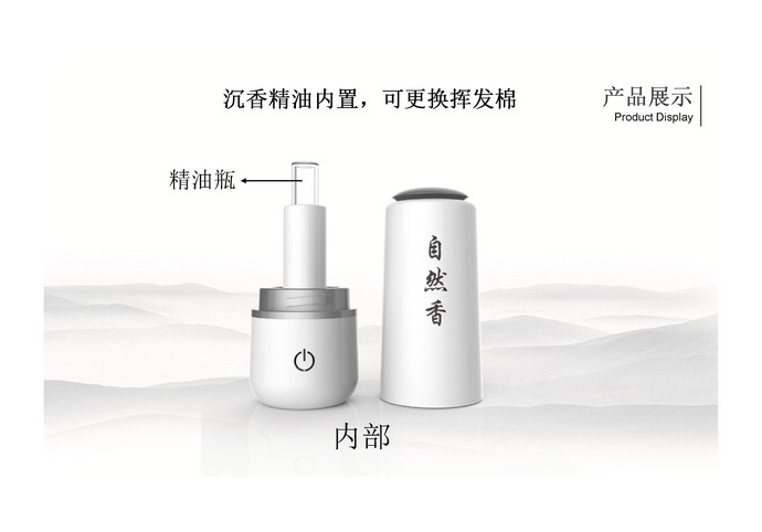 自然香,國內首款專為沉香精油而設計的熏香器,自然的味道就是好。其造型簡潔清秀,溫文儒雅,猶如一位滿腹經綸的玉面書生,內斂謙遜,身懷才學,絲毫不嘩眾取寵。產品支架設計巧妙,寓意為愛的擁抱,可以插在汽車出風口上,也可斜臥在桌面上。使用非常方便,智能觸摸開關控制,頂部按壓即可控制精油定量輸出,隨心所欲添加所需的精油量,滿足各個場合熏香使用。